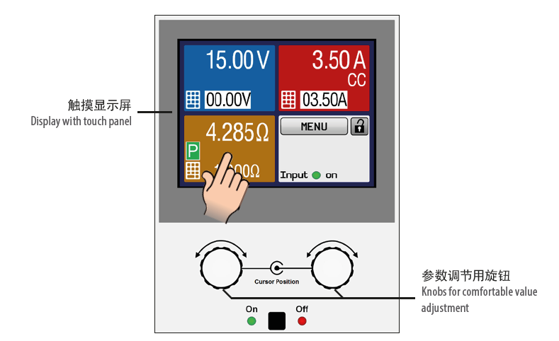 設定與實際輸入電壓、電流與功率都清晰顯示于彩屏上。彩色的TFT屏幕為敏感點觸式,用一個手指就能控制所有功能。